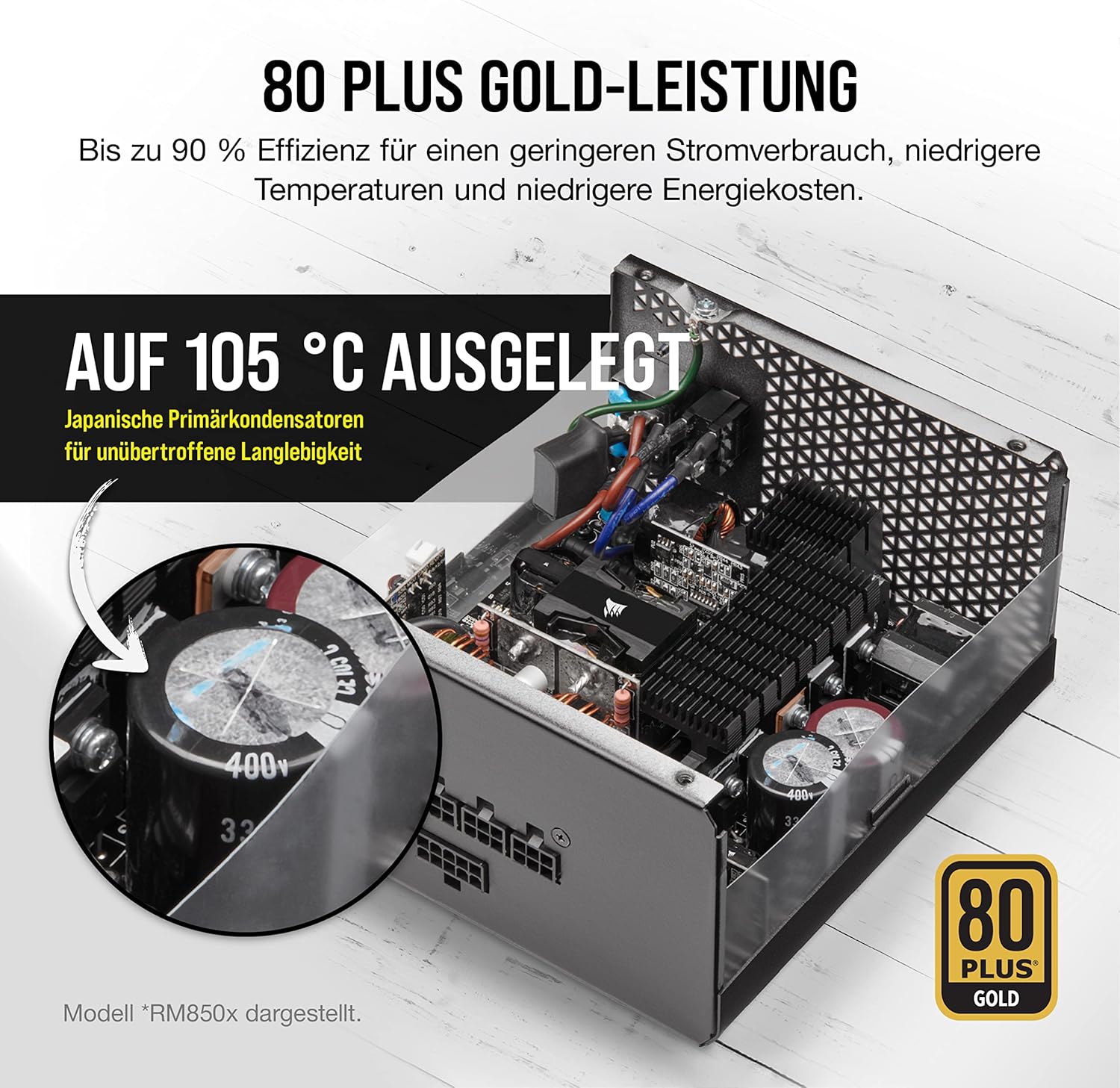 Corsair RM1000x 80 PLUS Gold Vollmodulares 1000 Watt ATX-Netzteil (135-mm-Lüfter mit Magnetschwebelager, Umfassende Kompatibilität, Japanische Kondensatoren, Extrem Schnelles Aufwachen) EU - Schwarz